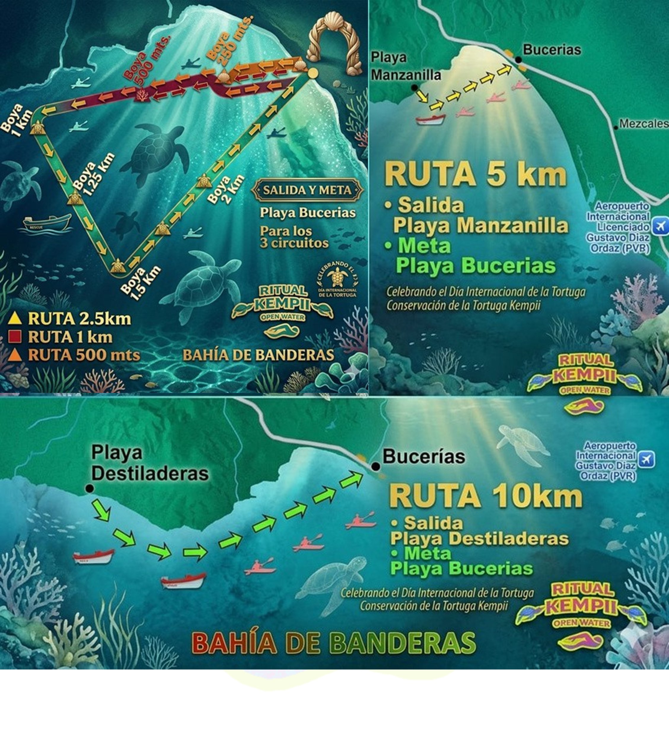 Para los circuitos de 2.5K, 1K y 500 mts., la salida y meta serán en el mismo punto en Bucerías.